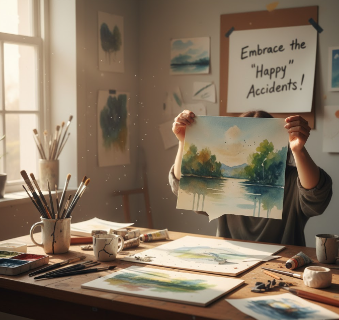 Bob Ross, the legendary TV painter, became famous not for technical perfection but for his calm attitude toward mistakes. His phrase—“We don’t make mistakes, just happy little accidents”—has inspired millions of artists.